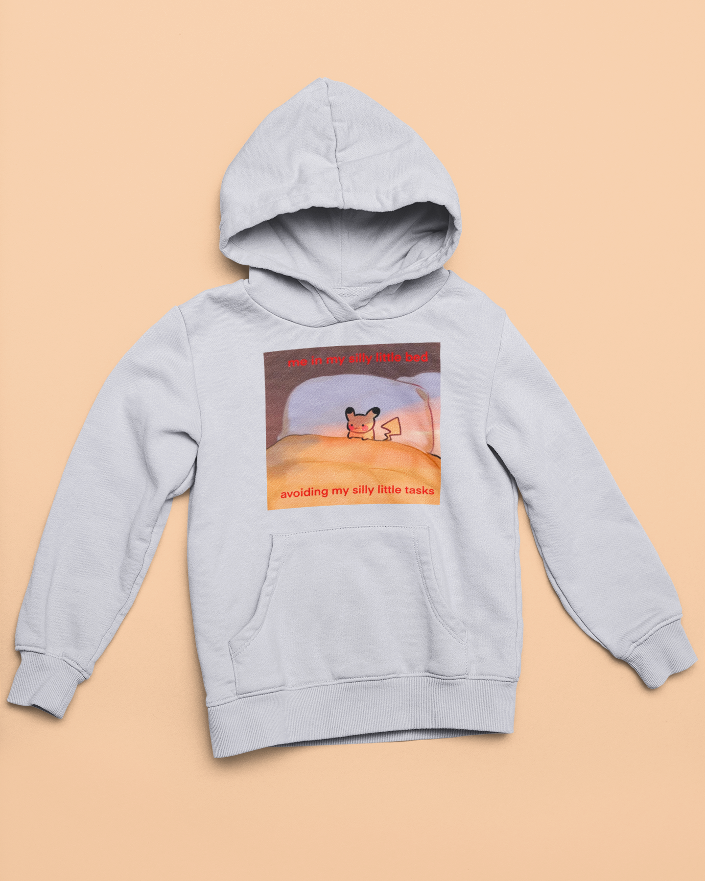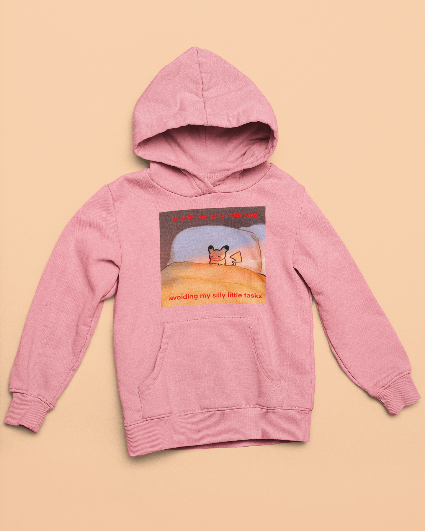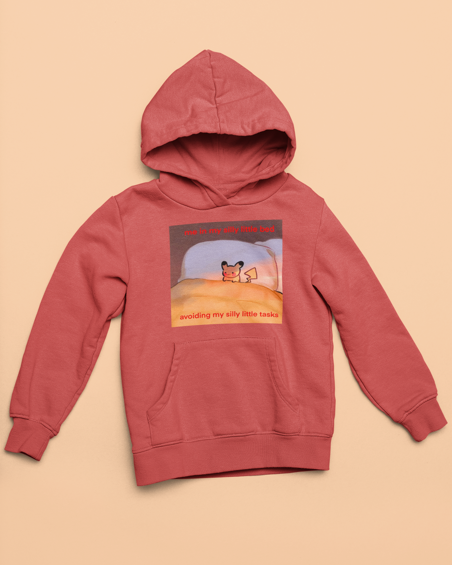 Printed on a super soft hoodie so you can actually wear it in your silly little bed as you avoid your silly little tasks.